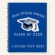 Personalize three lines of white text on this dark blue High School Senior Class of 2025 notebook. Whether your child is starting middle school, high school, college or you want to add the school name and other custom phrase, you can do that above and below the blue cap and tassel.