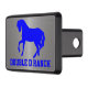 Personalize this handsome trailer hitch cover with graphics of a blue silhouette of a horse and blue bold text, at the bottom. The background is done in a brushed aluminum look. Makes a great gift idea to any horse lover or owner.