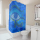 Shower curtain with Eye of Horus textured blue with gold outline abstract design. This design features the Horus Eye in blue tones on faded Horus Eyes in the background.