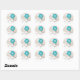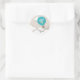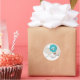 A sticker featuring an illustration of a blue hot air balloon floating above the clouds with sunburst background. Personalize the text. Matching birthday party invitations are available at Jill's Paperie.