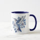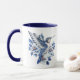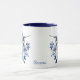On this pretty personalized mug, a blue hummingbird flits around white and gold flowers with blue leaves. The image is printed on both sides of the mug, with your custom text in matching blue. Everything stands out on a crisp white background.