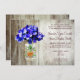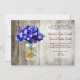 These rustic country wedding invitations feature a mason jar with blue hydrangea flowers against a rustic barn wood background. The mason jar has a wooden heart on the front of it. The same rustic distressed barn wood print is also on the back of the wedding announcement. Just add your wedding invitation wording to the template fields. Use the "Customize It" button if you need to move things around or change font style or font colour.