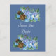 A lovelly staw basket with hydrangeas in shades of blue on a dusty blue background.