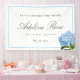This vinyl banner sign is a charming detail for a bridal shower or engagement celebration of the bride to be. Four lines text in elegant fonts are easy to personalize while a soft blue hydrangea flower and simple line border add a touch of grand millennial and cottage garden flair.