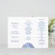 Programme de mariage triplé en blanc avec texte bleu et design de fleur d'hydrangée bleue. Remplir en tiers après l'achat pour créer trois pages avec le titre, les noms, la date et l'emplacement du service à l'avant. La section centrale contient les informations de cérémonie avec la droite pour lister la fête de mariage, note personnelle aux invités, en mémoire, ou tout ce que vous souhaitez. Une image d'hydrangée bleu clair se trouve au bas de la section du milieu.