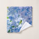 Blue hydrangeas in a blue vase with green leaves pattern.