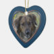 This heart shaped pet memorial ornament displays your pet's photograph in a blue and copper coloured frame. The frame is set against an attractive dark slate blue background. The back has the same background and frame, and the text "No longer at my side but always in my heart" with two custom text fields below it. We liked that text for our beloved Sadie, but we've made it customizable so that you may change it to whatever you'd like. It's also easy to upload your photograph. **Tip - crop a COPY of your photo in either a round or square shape. When uploaded, the photograph will fit underneath the gold frame, making it heart shaped. Use "Customize it" to make the photo larger or smaller within the frame. If you don't care for how the crop looks, you will still have your original copy to try a different crop.**
