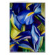 with original designs from original watercolour artwork of detailed, bright blue iris flowers on green background by Sacha Grossel. This detailed botanical inspired art design shows a close focus, macro floral design in cool colors of blue, green with yellow highlights.