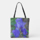 A close up photograph of a beautiful blue iris flower printed on both sides of a tote bag.