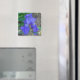 A close up photograph of a beautiful blue iris flower printed on a square fridge magnet.