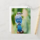 Cette carte postale présente une photo d'un pot bleu, avec un beau regard sur ses plumes le long du dos.