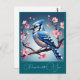 A STUNNING BLUE JAY SITS PROUDLY ON A DELICATE CHERRY TREE BRANCH, SURROUNDED BY LUSH GREEN LEAVES AND VIBRANT PINK BLOSSOMS.