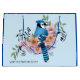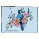 A blue jay bird surrounded by pink, purple and peach pastel coloured spring flowers set against a light blue backdrop.