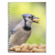A blue jay with a peanut in his beak, sitting behind a pile of peanuts. This image was taken in Ticonderoga, NY (the Adirondacks) by Debbie Quick of Debs Creative Images. To see more photography by Debbie, check out her website at: www.debscreativeimages.com