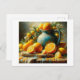 A rustic blue jug is surrounded by a vibrant array of fresh oranges, one of them sliced open to reveal their juicy insides along with lemons. White flowers add a delicate touch to the composition, enhancing the lively color contrast.
