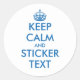 Blue keep calm and your text round stickers. Personalizable design. Customizable Keepcalm template with custom background colour and text. Vintage Keepcalmandcarryon theme. Make your own funny parody.