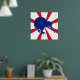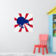 The blue shape of a kiwi bird against a white and red design. Red, white, and blue are the colours of New Zealand's flag.
