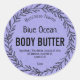 A blue label for homemade ocean scented soap, body butter and scrubs, The design features a white leafy wreath.