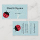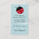 Promote any business in the child industry with this exclusive business card design featuring a blue background, simple white swirls and adorned with a single ladybug. Customizable text allows you to alter fonts, change text colours and sizes to best reflect your business. Suitable for daycares, babysitting, schools, children's clothing and toy stores.