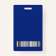Vertical Visitor's Pass badge in blue leather gradient design. All elements are changable or removable. Elements include: Visitor (can say "guest" or "pass" or any word, the phrase "Visitor Badge Must Be Returned Before Exiting the Building, company name, company department, Security barcode scan is on the back and can be changed or removed. Slot at top for lanyard, but you can choose another option, such as a metal clip or retractable strap.
