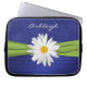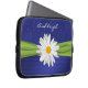 This personalized royal blue and lime green damask laptop sleeve with a FAUX ribbon and pleated look satin has a bright white Shasta Daisy flower image on it, along with a text box for you to customize with your own name, initials, business name, or other text. If you need any help customizing, please email niteowlstudio@gmail.com.