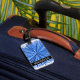 This luggage tag design features a pattern with lines coloured various shades of blue bursting out from a central point. It also features a personalized name on the front, and personalized contact details on the back.