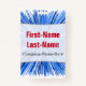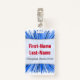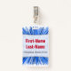 This badge design features a pattern with lines coloured various shades of blue bursting out from a central point. It also features a custom name in red coloured text within a white light area. There is also a customizable message under the name that could show information such as a job title, or a profession, or a business/company name. [~Z0000176]
