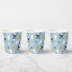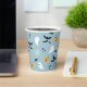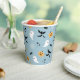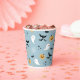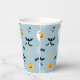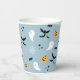 Cute paper cups featuring whimsical Halloween ghosts, pumpkins, spiderwebs and bats against a gentle blush blue backdrop.