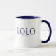 Lolo coffee mug design with established year featuring a blue stamped font set on a white background. Click customize to edit the background colour!. Visit our shop to view this mug in a large assortment of grandfather names.