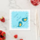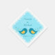 This is a cute wedding or bridal shower paper napkin, featuring two teal blue and tangerine love birds on a pretty lighter blue lace edged doily image background. A white swirled heart image is above the two birds. The customizable text is in darker matching teal. Bright and colourful!
