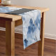 A table runner in dark blue, white and light blue marble liquid ink colours. The design is a dreamy romantic and elegant design with gold and silver traces like the coastal sea breeze shimmers. It looks like an abstract marmor stone texture and fluid lava at the same time interrupted by dusty blue stripes. This design fits perfect in coastal homes and makes the breeze come into your room.