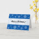 A card with an abstract blue marble like texture with flower motifs. Happy Birthday on the front on a white overlaid effect band and on the inside.