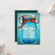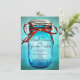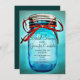 Here's a unique bridal shower invitation for a country bride. These feature a rustic mason jar in tinted aqua blue with a blue background. The mason jar has a burnt orange reddish bow tied around it. These are perfect for brides who will be having a country style wedding.