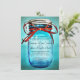 Blue Mason Jar Rustic Country Wedding Invitations with a blue tinted mason jar on a aqua blue distressed background. The mason jar has a burnt orange reddish bow tied around it. The back of the invitation is aqua blue with the word "Love" is white script in the centre. These are great for any country style wedding including rustic weddings, barn weddings, and any weddings using mason jars in the wedding reception decor.