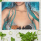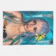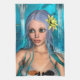 Cute mermaid with blue and green hair and yellow water lily flower on a blue fantasy ocean background