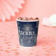 Sip your favourite holiday beverages with a festive set of Blue Merry and Bright Snowflakes Christmas Holiday Paper Cups. Paper cup design features falling snowflakes with the greeting Merry and Bright in a modern font and a soft white overlay. Additional gift and holiday items available with this design as well.