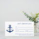 Nautical business gift certificate featuring an anchor with your monogram in navy blue and white. The backside is a matching shade of navy blue. This simple gift certificate is great for a boat rental company, fishing charter, yacht dealer or any nautical related business.