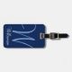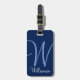 This elegant blue luggage tag design features a custom single letter monogram initial and a custom name in a script like font. The contact info on the back is also customized.