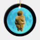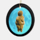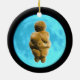 A Venus of Willendorf figure against a full blue moon. Black background.