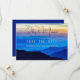 Mariage de montagne enregistrer les cartes de date avec l'image de montagnes bleues. Customisez avec un texte moderne et tourbillonnant pour les prénoms du couple en haut de la carte en bleu foncé sur un coucher de soleil / ciel lever. À moins que les noms complets ne soient courts, seuls les prénoms s'adaptent à l'espace. "Enregistrer la date" texte dans le centre sur les montagnes bleues vibrantes et la date et l'emplacement de l'événement dans le texte plus petit en dessous. L'inverse est bleu foncé. Mettez le papier à niveau comme vous le souhaitez.