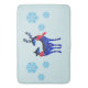 Bathmat with a light greenish blue background. Illustrated with a pair of blue scandinavian deer wearing red scarves. Decorative markings on their bodies. Fancy blue beaded snowflakes add to the wintery feel of the design.