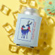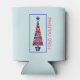 Can cooler with a light green and white snowy looking background. Illustrated with a pair of blue scandinavian deer wearing red scarves. With decorative markings on their bodies. On the back is a nordic style Christmas tree in blue and red with a star on top. The text is editable and says Christmas Cheer (on the front) and Merry Christmas (on the back).