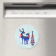 A magnet with a light green and white snowy looking background. Illustrated with a pair of blue scandinavian deer wearing red scarves. With decorative markings on their bodies. A nordic style Christmas tree in blue and red with a star on top, stands beside the reindeer.