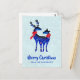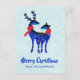 A holiday postcard which says Merry Christmas and a personalized message on the back. Designedwith a light green and white snowy looking background. Illustrated with a pair of blue scandinavian deer wearing red scarves. With decorative markings on their bodies.