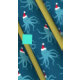 Wrapping Paper with a novelty Christmas pattern of smiling, blue, octopus illustrations wearing Santa hats on a blue background.