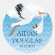 This fun sticker features a stork flying over a blue ombre chevron background. What's unusual is the stork doesn't have a baby in the bag since the baby has already been delivered. Bottles of wine, champagne and baby bottles are in the bag to make the celebration of baby's arrival complete. Use as cupcake topper stickers for a Sip and See, as envelope seals or on favour bags, or customize it as a thank you for a baby shower. Available in alternate colours with matching products.