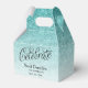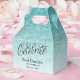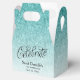 This beautiful favour box features faux blue ombre glitter and your custom text along with the word Celebrate in fancy script. Use the template form to add your information. The Customize feature can be used to change the font and the text layout. You can also add text to the other side of the favour box.
