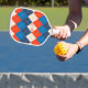 Personalized pickleball paddle. The argyle pattern has long been recognized as a classic design that has stood the test of time. The repeated diamond-shaped pattern evokes a sense of sophistication and elegance, adding a touch of refinement to pickleball attire and accessories. The symmetry and precision of the pattern also align with the sometimes meticulous angles and shots of the sport of pickleball. Additionally, the combination of bold and contrasting colours within the argyle design creates visual interest and makes a statement on the pickleball court. Overall, the argyle pattern as timeless charm, aesthetic appeal, and ability to add a touch of style and personality to any pickleball gear. Colourful Blue, Orange, and White pickleball-themed gift for your pickleball-loving mom, dad, uncle, aunt, brother, sister, neighbour, grandpa, grandma, husband, wife, friend, or work colleague who won't stop talking about pickleball.