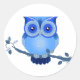 Stickers has a blue monochromatic design of a owl on a branch with leaves.
