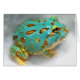 Cute as can be, Pac-Man frogs come in a variety of colours, including the Blue Pac-Man frog. They are cute little sit-and-wait predators who stalk their prey and then open their huge mouths and suck their prey into their big, round bellies. They are also cannabalistic! And watch out how you handle them. Stick your hand in front of one, and you might get a rather nasty bite. As you probably guessed, they are called Pac-Man frogs because they resemble the video game character of the same name. Find matching postage stamps in our gallery. Caveat: I am a designer, not an expert in herpetology. If I have not identified this animal properly, please leave a comment with the proper identification. Thank you.